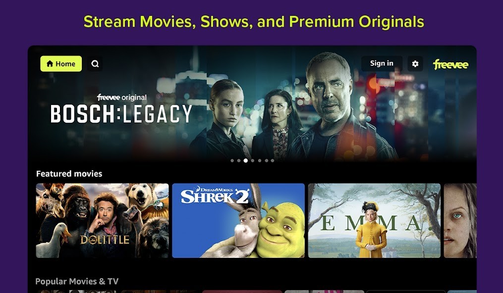 Watch thousands of hit movies, shows, Freevee Originals, and live 24/7 entertainment channels to match your mood. With new releases added monthly, enjoy Hollywood hits, quality shows, and exclusive Originals. Freevee is supported by Ads and has no hidden fees, no subscription tiers, and no monthly payments. Enjoy what you like, how you like, and as many times as you like. Install the Freevee App on your Android TV.For our Terms of Use and Privacy Notice, please see https://www.amazon.com/privacy. Amazon, Freevee, Prime Video and all related marks are trademarks of Amazon.com, Inc. or its affiliates.